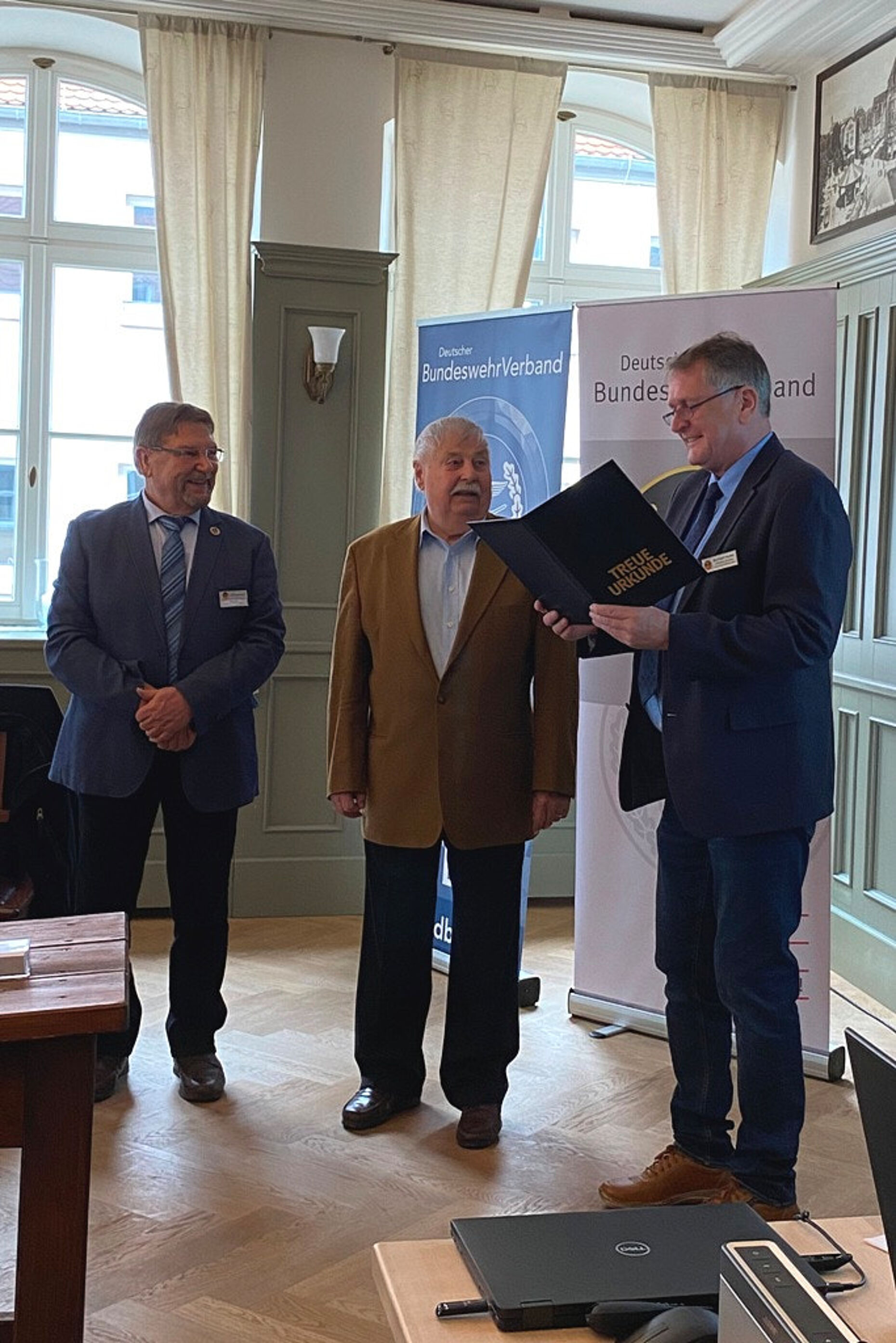 Major a.D. Horst Schickram ist dem BundeswehrVerband bereits 1963 beigetreten und damit sechs Jahrzehnte Mitglied. Den ehemaligen Starfighter-Piloten überraschte Vorsitzender Lipp neben der Treueurkunde mit einem DBwV-Kaffeebecher und einem Bildband „30 Jahre Jagdbombergeschwader 32“.
