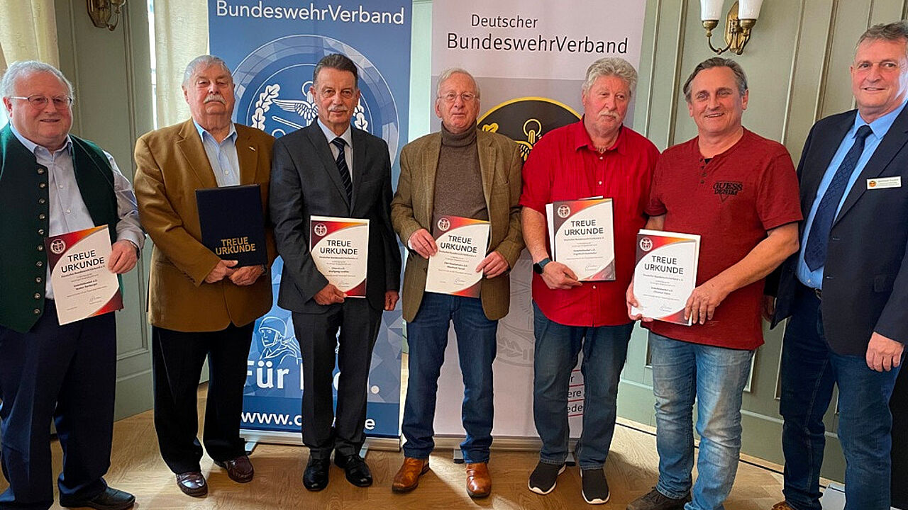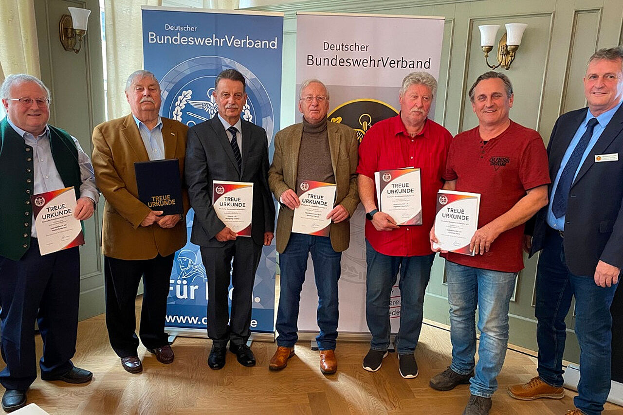Lipp startete mit Unterstützung des Vorsitzenden ERH im Landesverband Süddeutschland, Oberstabsfeldwebel a.D. Bernhard Hauber, mit den Ehrungen der Mitglieder, die dem BundeswehrVerband seit nunmehr bis zu einem halben Jahrhundert angehören. Da sind Stabsfeldwebel a.D. Christian Heinz (25 Jahre) und Oberst a.D. Wolfgang Liedtke (40 Jahre). 50 Jahre dabei sind die beiden Stabsfeldwebel a.D. Engelbert Eisenhofer und Walter Renberger sowie Oberbootsmann d.R. Manfred Versal.