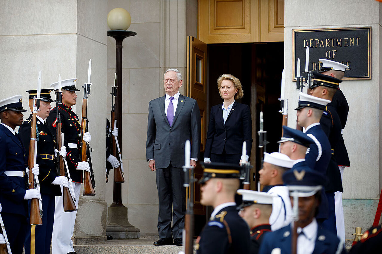 Mattis gilt vielen Europäern als einer der letzten verlässlichen Partner in der Trump-Administration. Auch er sendete versöhnliche Signale an den deutschen Besuch. Es sei gut, die deutsche, demokratische Stimme laut und deutlich auf internationaler Bühne zu hören. Deutschland sei eines der weltweit am meisten respektierten Länder. „Die Vereinigten Staaten betrachten das Verhältnis nicht als selbstverständlich“, sagte er. Die CDU-Ministerin besucht die USA unter schwierigen Vorzeichen. Washington und Berlin streiten seit Monaten über die Höhe der Verteidigungsausgaben innerhalb der Nato und die Lastenteilung im Bündnis. US-Präsident Donald Trump wirft insbesondere Deutschland vor, zu wenig in die Verteidigung zu investieren. Der Konflikt könnte beim Nato-Gipfel Mitte Juli in Brüssel erneut aufbrechen. Die USA bestehen darauf, dass die Nato-Partner und insbesondere Deutschland wie 2014 vereinbart spätestens 2024 jeweils zwei Prozent des Bruttoinlandsprodukts für die Verteidigung ausgeben. Aus deutscher Sicht ist aber allenfalls eine Annäherung an dieses Ziel gemeint. Auch wenn sich die Bundesregierung noch zu dem Nato-Ziel bekennt, will von der Leyen zumindest bis 2024 nicht so viel ausgeben. Als neue Zielmarke gab sie vor kurzem 1,5-Prozent aus - das sei immerhin eine Steigerung um 80 Prozent innerhalb eines Jahrzehnts.Mattis würdigte die deutschen Anstrengungen zur Erhöhung des Wehretats. „Wir begrüßen die Ankündigung, dass Deutschland seine Verteidigungsausgaben bis 2024 um 80 Prozent steigern will“, sagte Mattis. Das sende eine Nachricht an die Länder, die andere bedrohten und internationales Recht verletzten. Mattis würdigte auch das Engagement Deutschlands innerhalb der Nato, etwa in Afghanistan. Im Anschluss an das Treffen legten von der Leyen und Mattis einen Kranz am 9/11-Memorial am Pentagon nieder. Anschließend stand für die deutsche Ministerin ein Besuch des Nationalfriedhofs Arlington und ein Gespräch mit US-Außenminister Mike Pompeo auf dem Programm.