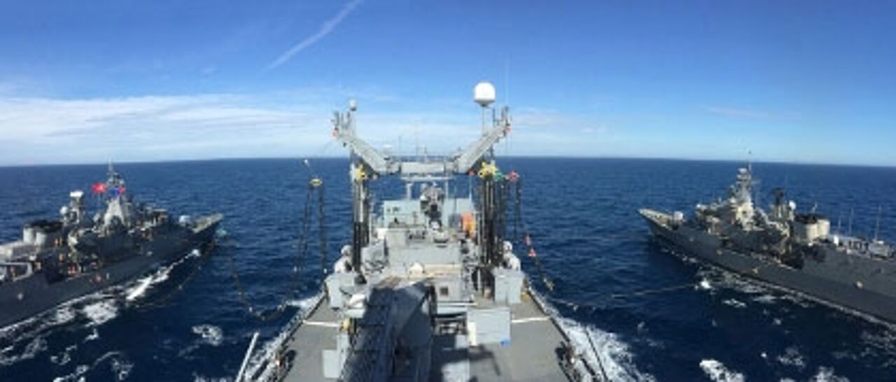 „Bonn“ im Versorgungsmanöver mit griechischer und türkischer Fregatte. Foto: 2016 Bundeswehr / Ole Paffenholz