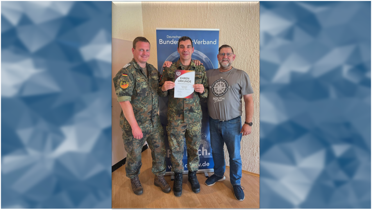 Bezirksvorsitzender Stabsfeldwebel Christian Schleicher mit dem ausgezeichneten Stabsfeldwebel Pierre Stoya und StoKa-Vorsitzendem Techn. Regierungshauptsekretär Wolfang Scharl. Foto: Christian Schleiche
