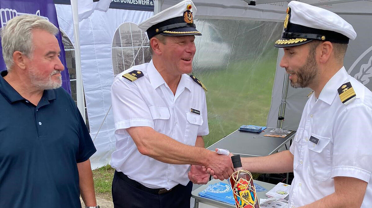 Mit einer Flasche Rum, der speziell zum 175-jährigen Jubiläum der Deutschen Marine hergestellt wurde, bedankte sich Kapitänleutnant Carsten Bracker (M.) beim Stützpunktkommandanten, Fregattenkapitän Robert Lehmann (r). Foto: Olaf Pietrzak