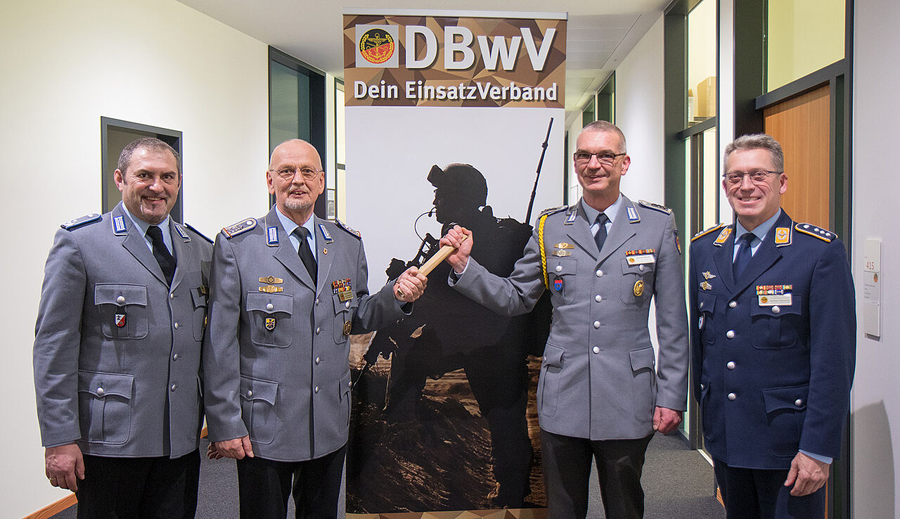 Übergabe des Staffelstabs: Oberstabsfeldwebel a.D. Thomas Bielenberg (2.v.l.) übernimmt von Oberstabsfeldwebel Stefan Weyer im Beisein des 2. Stellvertreters des Bundesvorsitzenden, Hauptmann Andreas Steinmetz (r.), und dem stellvertretenden Landesvorsitzenden Süddeutschland, Oberstleutnant Josef Rauch Foto: DBwV