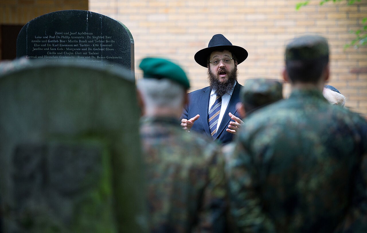 Rabbiner Yehuda Teichtal begrüßt ehrenamtliche Helfer und Bundeswehrsoldaten, die den jüdischen Friedhof Weißensee in Berlin säuberten. Foto: dpa