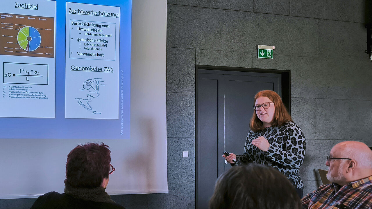 Zuchtberaterin Angelina Grewe erklärte mit Charme und Fachwissen, wie aus einem netten Kalb ein international gefragter Spitzenbulle wird. Foto: Detlef Döring
