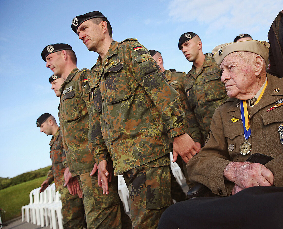 Deutsche Soldaten neben einem Veteran des Zweiten Weltkriegs bei den Gedenkfeiern zum 70. Jahrestag der Invasion in der Normandie (D-Day). Unterschiedliche Kulturen prägen den Umgang mit Veteranen. Foto: getty images