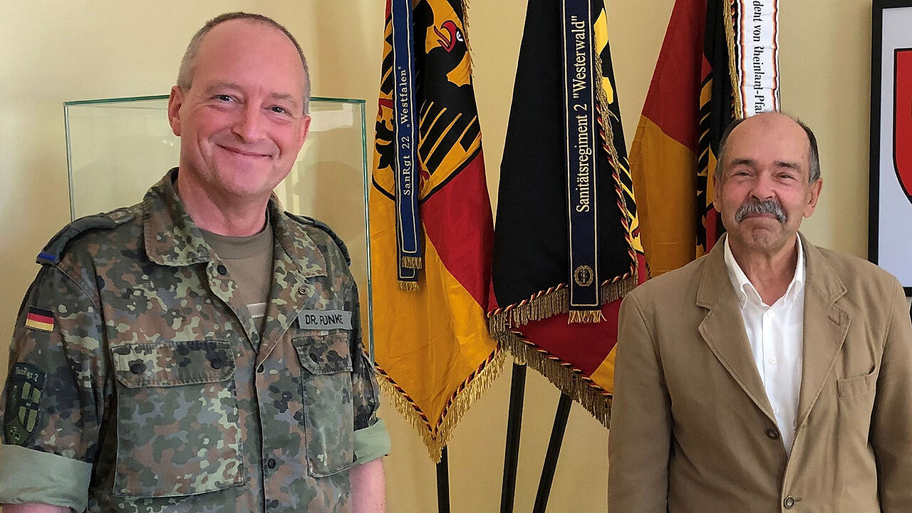 ERH-Vorsitzender Friedhelm Chmieleck (r.) knüpfte erste Kontakte nach seiner Wahl, hier mit Oberstarzt Dr. Sven Funke, Kommandeur Sanitätsregiment 2 „Westerwald“. Foto: HKL