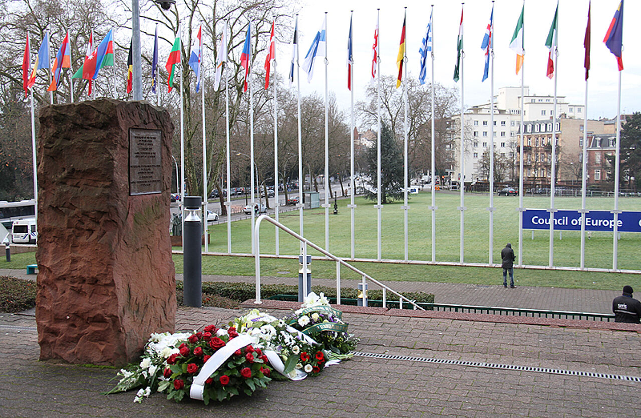 Blumen vor dem "Auschwitz-Gedenkstein" in Strasbourg. Foto: DPA