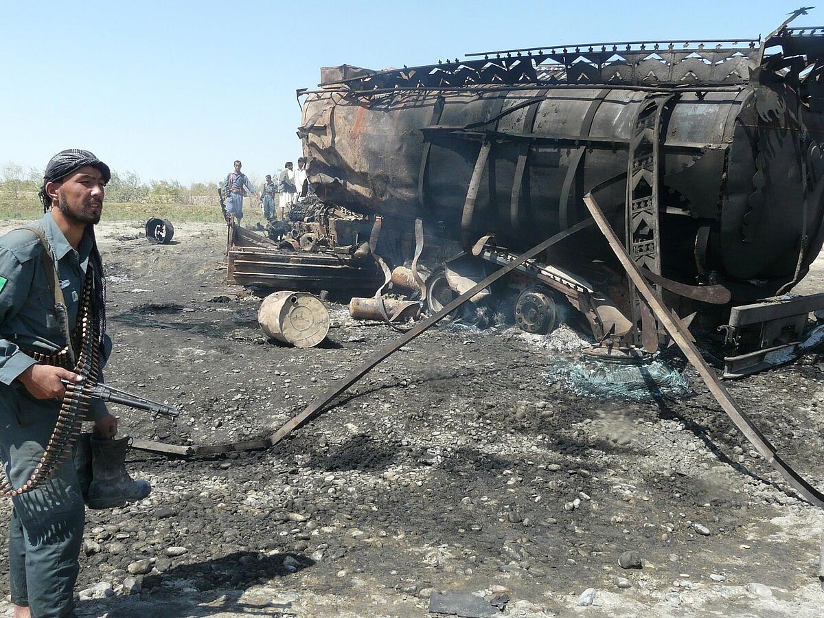 Ein Angehöriger der afghanischen Sicherheitskräfte inspiziert einen der völlig zerstörten Tanklaster. Foto: dpa