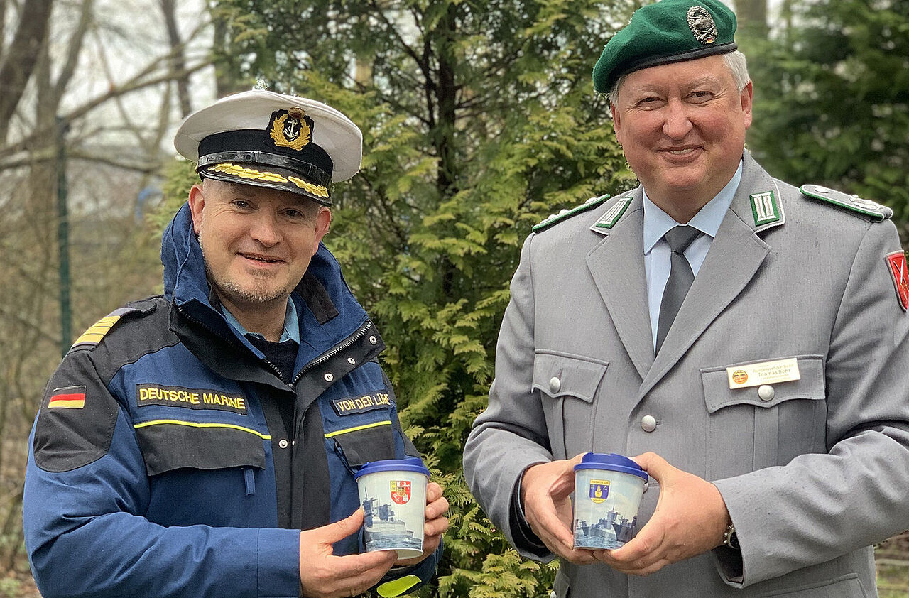Der Vorsitzende des Landesverbandes Nord, Oberstleutnant Thomas Behr, und der verantwortliche Bezirksvorsitzende für den Großstandort Wilhelmshaven, Oberstleutnant Jörg Struckmeier, haben die F125 „Delta-Besatzung“ „des 4. Fregattengeschwaders besucht. Behr hatte im vergangenen Jahr die Gelegenheit, die Frauen und Männer im Rahmen des Wechselbesatzungskonzeptes auf der Fregatte Nordrhein-Westfalen kennenzulernen. Da die Besatzung regelmäßig gewechselt werden muss wurde dabei der Wunsch geäußert, zumindest kleine Identifikationsmerkmale zu kreieren.