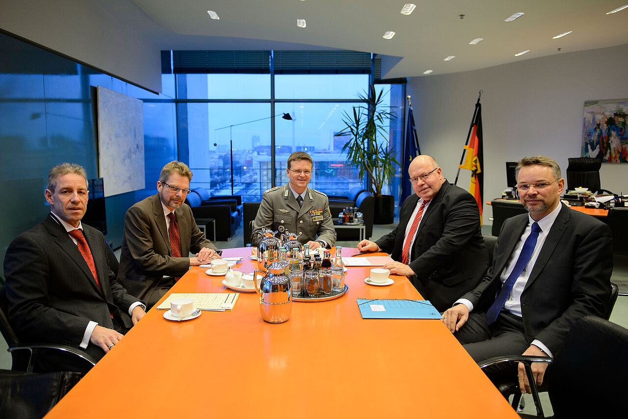 Polizeidirektor Carsten Glade vom Bundespolizeipräsidium, Fritz von Korff/DBwV-Abteilungsleiter Politik, DBwV-Chef André Wüstner, CDU/CSU-Politiker Peter Altmaier, Chef des Bundeskanzleramtes und Bundesminister für besondere Aufgaben, Brigadegeneral Andreas Delp, Leiter der Gruppe Militär- und Sicherheitspolitik im Bundeskanzleramt. Foto: DBwV