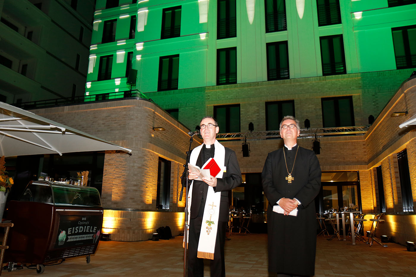 Vor allem Verteidigungsministerin Ursula von der Leyen hob genau diese Rolle des Verbandes hervor. In Anspielung auf den alten Brauch, zum Einzug in ein neues Haus Salz und Brot zu schenken, sagte Sie: „Der DBwV ist das Salz in der Suppe – und manchmal auch in der Wunde! Bitte bleiben Sie so.“ Auch diese Worte sind alles andere als selbstverständlich für eine Verteidigungsministerin, schließlich hat der Verband häufig genug auf Missstände hingewiesen und gerade im vergangenen Jahr immer wieder den Finger in die Wunde gelegt. Angesichts der noch wartenden Aufgaben in der Truppe sagte die Ministerin, dass man „einen Berg nicht allein hochsteigen“ solle. Der DBwV sei für sie der Kamerad, mit dem sie den Aufstieg wagen will. Zumindest der Verband hat mit dem Einzug in die neue Immobilie eine große Bergetappe bereits hinter sich gebracht. Rund 150 Mitarbeiter finden in dem sechsgeschossigen Bau in Berlin-Kreuzberg Platz. Errichtet wurde er vom Bauunternehmen Kondor Wessels. Und, das darf man gerade in Berlin auch einmal ganz laut sagen: Das Haus wurde sechs Monate früher fertig als geplant und blieb im Kostenrahmen! Zur Feier des Tages gab es eine riesige Videoprojektion an der Außenfassade des neuen Gebäudes. Die Militärseelsorge, vertreten durch Bischof Dr. Sigurd Rink und Monsignore Wolfgang Schilk, segnete zudem die Menschen und ihre Arbeit in der neuen Immobilie.