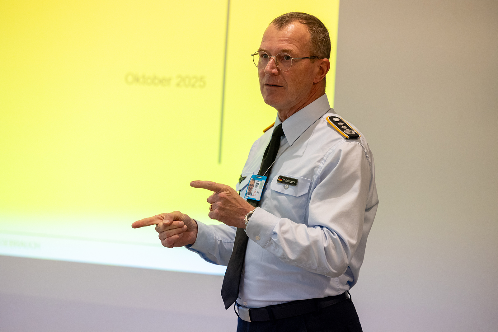 Oliver Krause, Abteilungsleiter Politik im DBwV, beschrieb in seinem Vortrag zur aktuellen Lage und zu den Aufgaben seiner Abteilung in diesen bewegten Zeiten. „Die Aufgaben für Deutschland werden größer, weil der Beitrag größer werden muss, wenn sich die Vereinigten Staaten auf andere Ziele wie den Pazifikraum verstärkt konzentrieren.“ Die Menschen in Deutschland, so Krause, seien durchaus bereit, den neuen Weg in der Sicherheits- und Verteidigungspolitik mitzugehen, das beweisen zahlreiche Umfragen. „Aber, die Politik liefert nicht schnell genug.“ Schwerpunktthemen der Abteilung Politik seien: Der Neue Wehrdienst und der wichtige Aufwuchs bei den Profis in der Bundeswehr, das Artikelgesetz Militärische Sicherheit, der Bundeshaushalt 2026 und natürlich alle Tarifangelegenheiten wie auch die verfassungskonforme Besoldung.