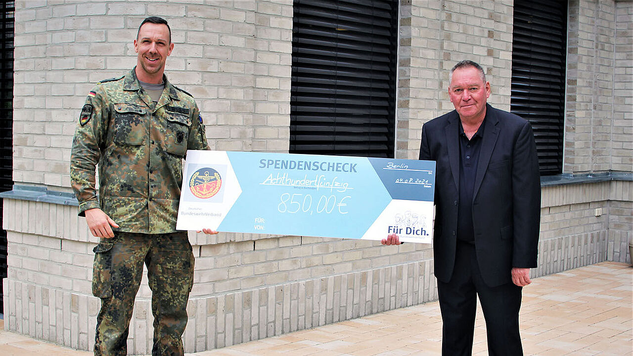 Einen Spendenscheck in Höhe von 850 Euro hat jetzt Hauptfeldwebel Stefan Walczak an Hauptmann a.D. Uwe Köpsel, Vorsitzender der Soldaten und Veteranen Stiftung (SVS) des DBwV, übergeben. Das Geld kommt nun der Arbeit der Stiftung zugute.
