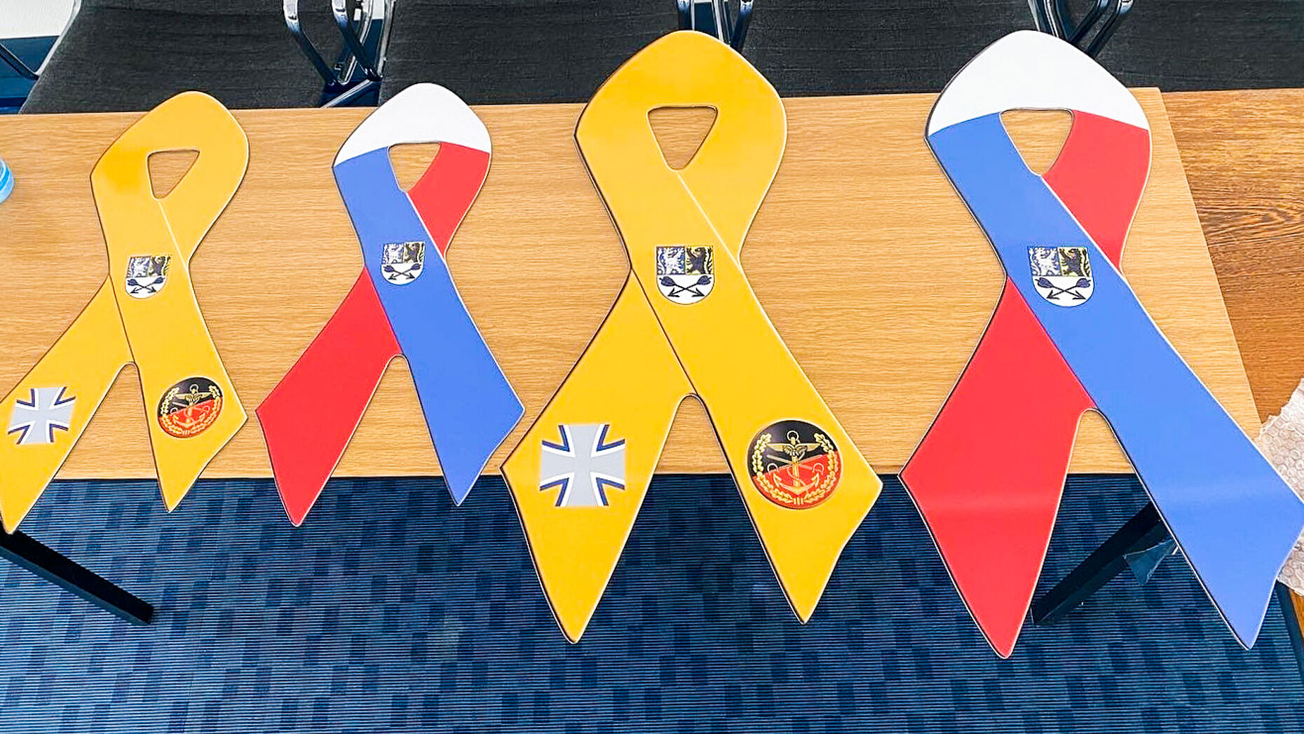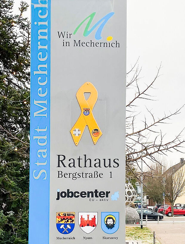 Was ist eigentlich die gelbe Schleife? Die Schleife ist ein sogenanntes Awareness Ribbon. Diese dienen international als Zeichen der Verbundenheit mit einer bestimmten Gruppe. Die gelbe Schleife steht dabei für die Solidarität mit Angehörigen der Streitkräfte. Ursprünglich stammt die Idee der gelben Schleife aus den USA, fand aber nach dem Jahr 2010 auch in Deutschland Verbreitung. Auf den Schleifen sind grundsätzlich drei Wappen oder Logos zu sehen. In der Mitte ist das jeweilige Wappen des Kreises oder der Stadt/Gemeinde, auf dem rechten Flügel das Eiserne Kreuz. Das Kreuz ist Bestandteil der Bundeswehr-Tradition und nicht ohne Grund in stilisierter Form seit 1956 das Erkennungszeichen auf allen Fahrzeugen der Bundeswehr zu sehen. Gestiftet hat das Originale im Jahr 1813 der Preußenkönig Friedrich Wilhelm III.
