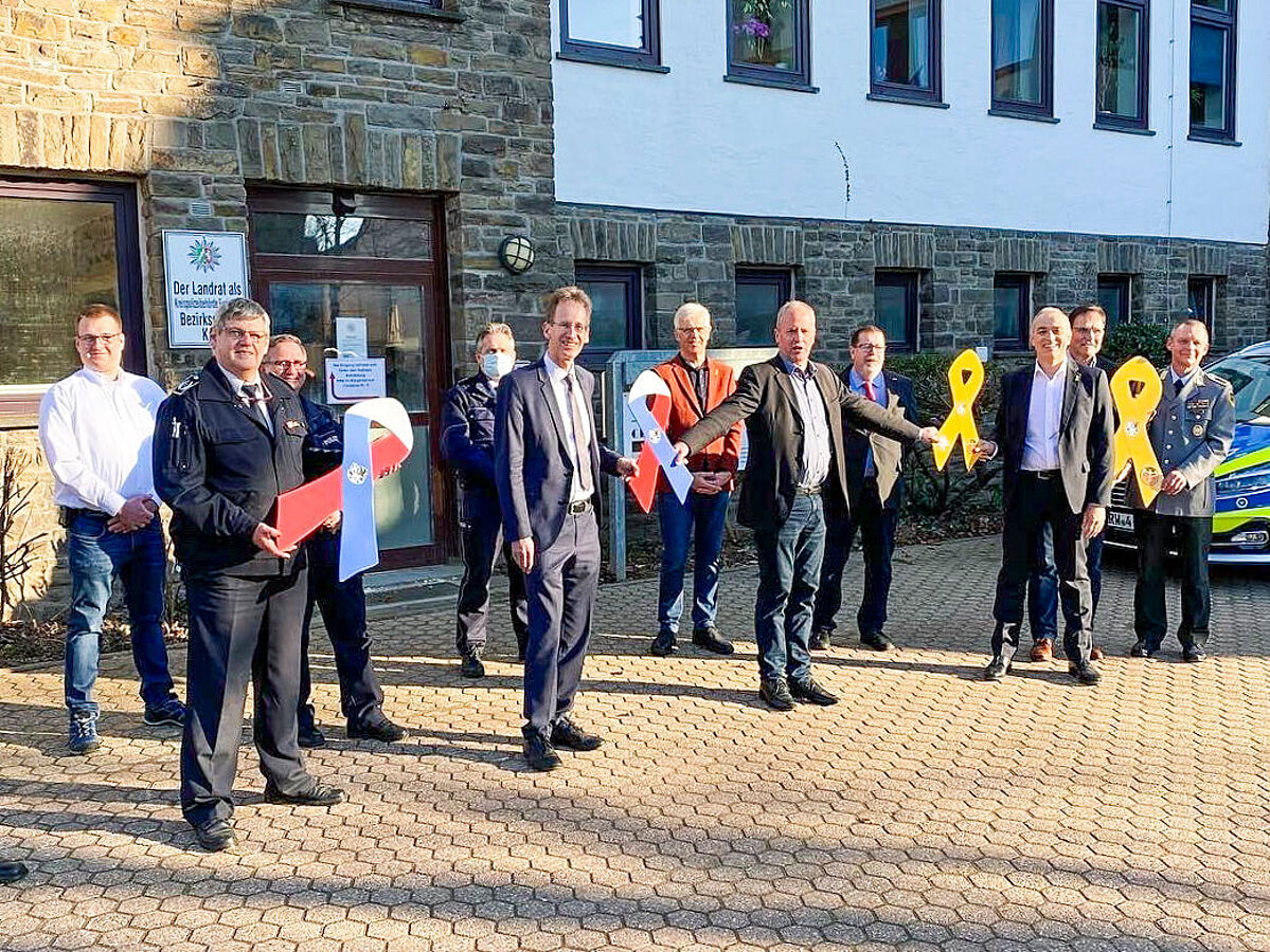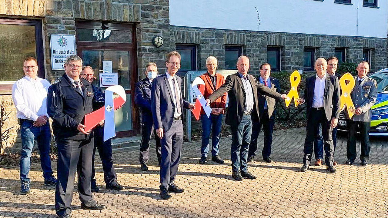 Neben dem Bürgermeister Hermann Josef Esser und seinem allgemeinem Vertreter Michael Heller waren der Bundestagsabgeordnete Detlef Seif, Vertreter der Gemeinde Kall sowie Polizei, Feuerwehr, THW und DRK anwesend. Esser betonte, dass der Abschluss etwas Besonderes ist, da Bürgerinnen und Bürger gerade in den letzten Monaten sehr viel Hilfe von Uniformträgern erfahren haben. Neben der Corona und Fluthilfe ist die angespannte Situation im Ukrainekrieg von besonderer Bedeutung für die Bevölkerung. Görlich stellte anschließend den Anwesenden das Projekt und die Schleifen vor. Der Abgeordneter Seif gab einen Einblick in das politische Geschehen in Berlin rund um dem Konflikt.