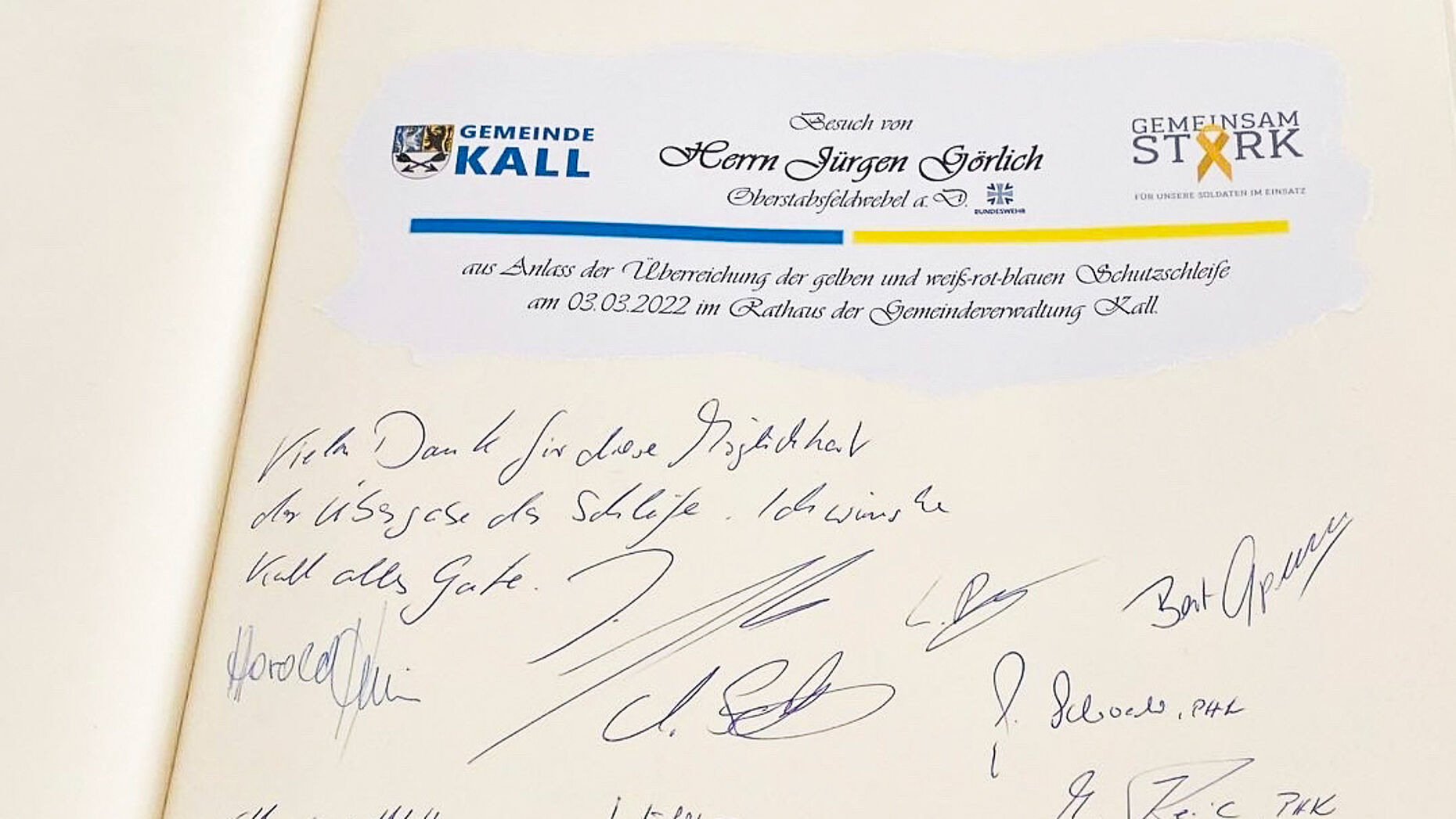 „Ich war begeistert von der Zustimmung und der Bereitschaft des Landrates und der Bürgermeisterinnen und Bürgermeister unseres Kreises,“ so Görlich nach dem Termin in Kall. Besonders positiv war das Interesse an der Bundeswehr im Allgemeinen und an den Standorten Mechernich und Euskirchen. Begleitet wurde Görlich von der Standortkameradschaft Euskirchen, insbesondere von dem Vorsitzenden Stabsfeldwebel Andre Korb. Aus dem letzten Termin in Kall wurde eine richtige Feierstunde. Hier fand zum ersten Mal etwas ganz besonderes statt. Neben der gelben Schleife wurde auch noch eine „Schutzschleife“ in den Farben rot, weiß und blau übergeben. Diese „Schutzschleife“ symbolisiert durch die Farben Verbundenheit mit den Einsatzkräften. Sie steht für die Polizei-, Feuerwehr- und Rettungskräfte und wurde zuerst in Hessen am Tag der Polizei durch Ministerpräsident Bouffier ins Leben gerufen. Schutzschleifenträger zeigen ihre Solidarität und Wertschätzung für die Frauen und Männer, die tagtäglich mit ihrer Arbeit und oft auch mit ihrem Leben für uns einstehen.