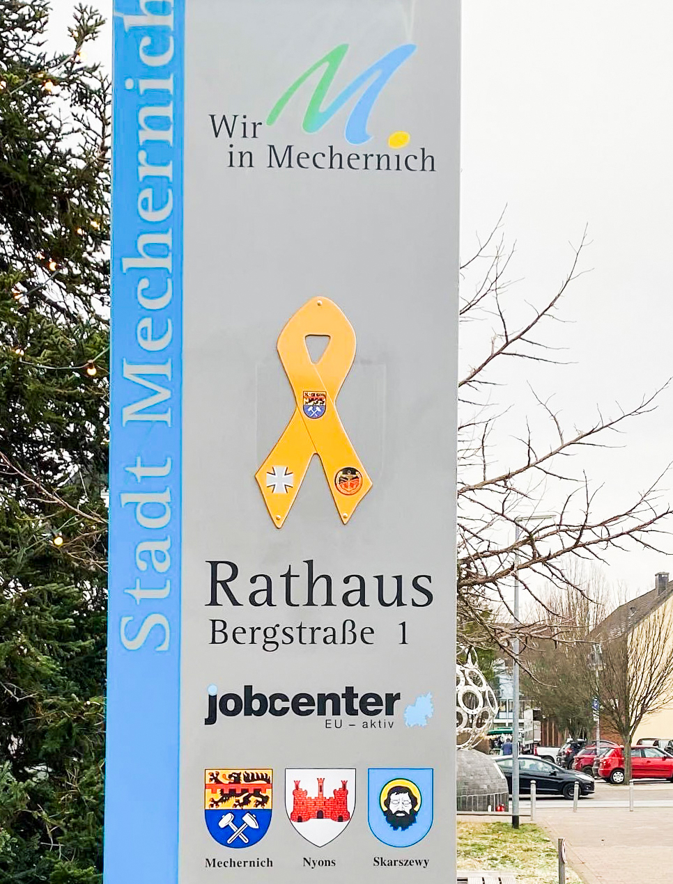 Es ist vollbracht! Was am 07.01.2021 im Kreishaus mit der Übergabe der ersten gelben Schleife an Landrat Ramers begann, endete am 03.03.2022 mit der Übergabe der letzten gelben Schleife in Kall an den Bürgermeister Hermann Josef Esser. Das heißt auch: Mission accomplished für Oberstabsfeldwebel a.D. Jürgen Görlich. Selbst aus Euskirchen wollte er als Zeichen der tiefen Verbundenheit zwischen der Bundeswehr und dem Kreis Euskirchen mit der Unterstützung des Deutschen BundeswehrVerbandes alle Kreis- und Rathäuser mit einer gelben Schleife ausstatten.