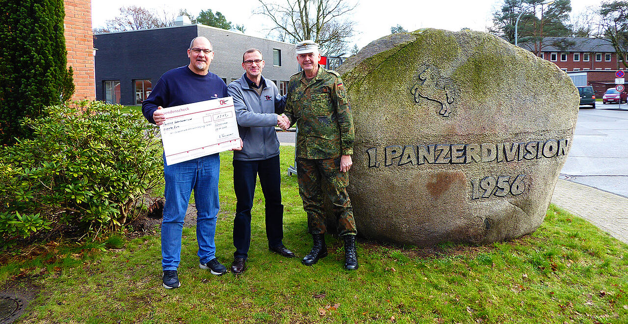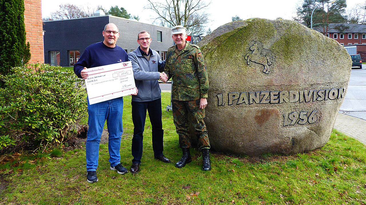 Karl-Heinz Schütz, Gründungsmitglied des Airborne-Fit-Run e.V. und der Vereins-Vorsitzende Reiner Trosiener bei der feierlichen Übergabe an Brigadegeneral Michael Matz (v.l.)