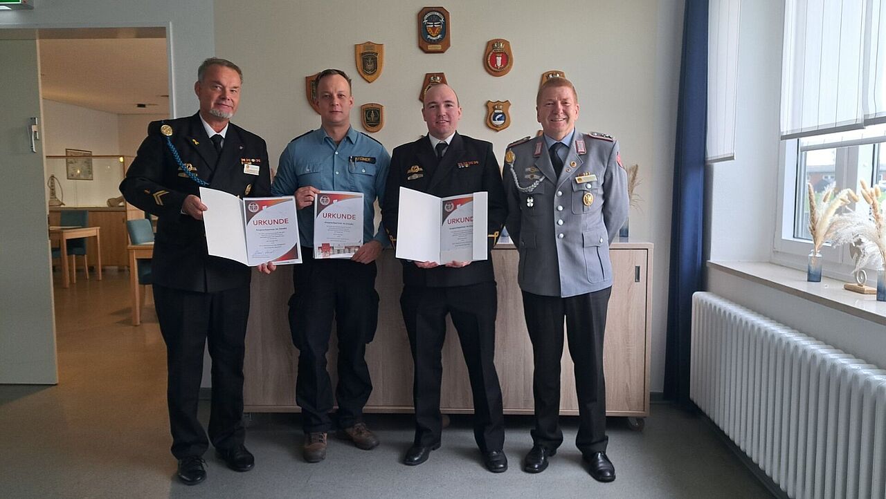 Wilhelmshaven. Stabsfeldwebel a.D. Gerd Dombrowski hat in Wilhelmshaven gleich drei Ansprechpartner in Einsätzen und Missionen mit Urkunden und Coins geehrt. Der stellvertretende Landesvorsitzende Nord zeichnete die Hauptbootsmänner Moritz Steiner und Patrick Baur aus. Die beiden waren im 26. Kontigent NATO Ustg Ägäis als Ansprechpartner des DBwV auf dem Einsatzgruppenversorger Frankfurt am Main für ihre Kameraden jederzeit ansprechbar. Der Oberbootsmann Jens Wohlgemuth war in der Ständigen NATO-Seestreitkräftegruppe (SNMG1) als Ansprechpartner auf der Fregatte Hessen für seine Kameraden das Bindeglied zum DBwV. Während der Ehrungsrunde gab es einen regen Austausch zum Thema Einsätze und Missionen der Marine sowie über allgemeine Bundeswehr-Themen, wie dem bevorstehenden „neuen Wehrdienst“.