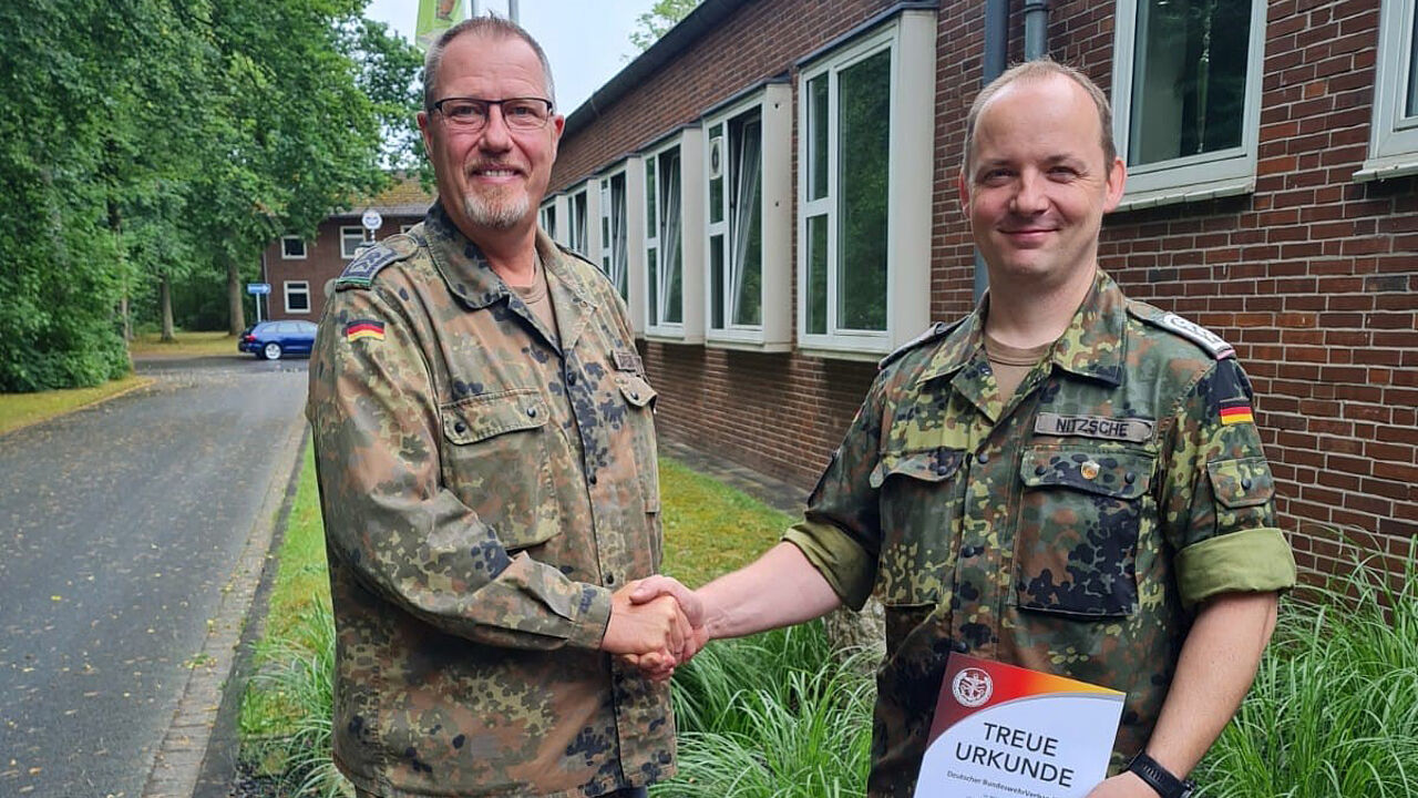 Munster. Durch den Bezirksvorsitzenden im Bezirk 4, Stabsfeldwebel Hannes Dreier, wurde der Vorsitzende der Truppenkameradschaft Panzertruppenschule für seine 25-jährige Mitgliedschaft im Deutschen BundeswehrVerband geehrt. Oberstabsfeldwebel Robert Nitzsche führt, mit knapp 1100 Mitgliedern, die zweitgrößte Truppenkameradschaft in Niedersachsen Ost (Heide). Dreier dankte Nitzsche für sein stetiges Engagement, nicht nur bei internen Veranstaltungen seiner Dienststelle, sondern auch bei der Unterstützung der Standortkameradschaft Munster in ihren Vorhaben.