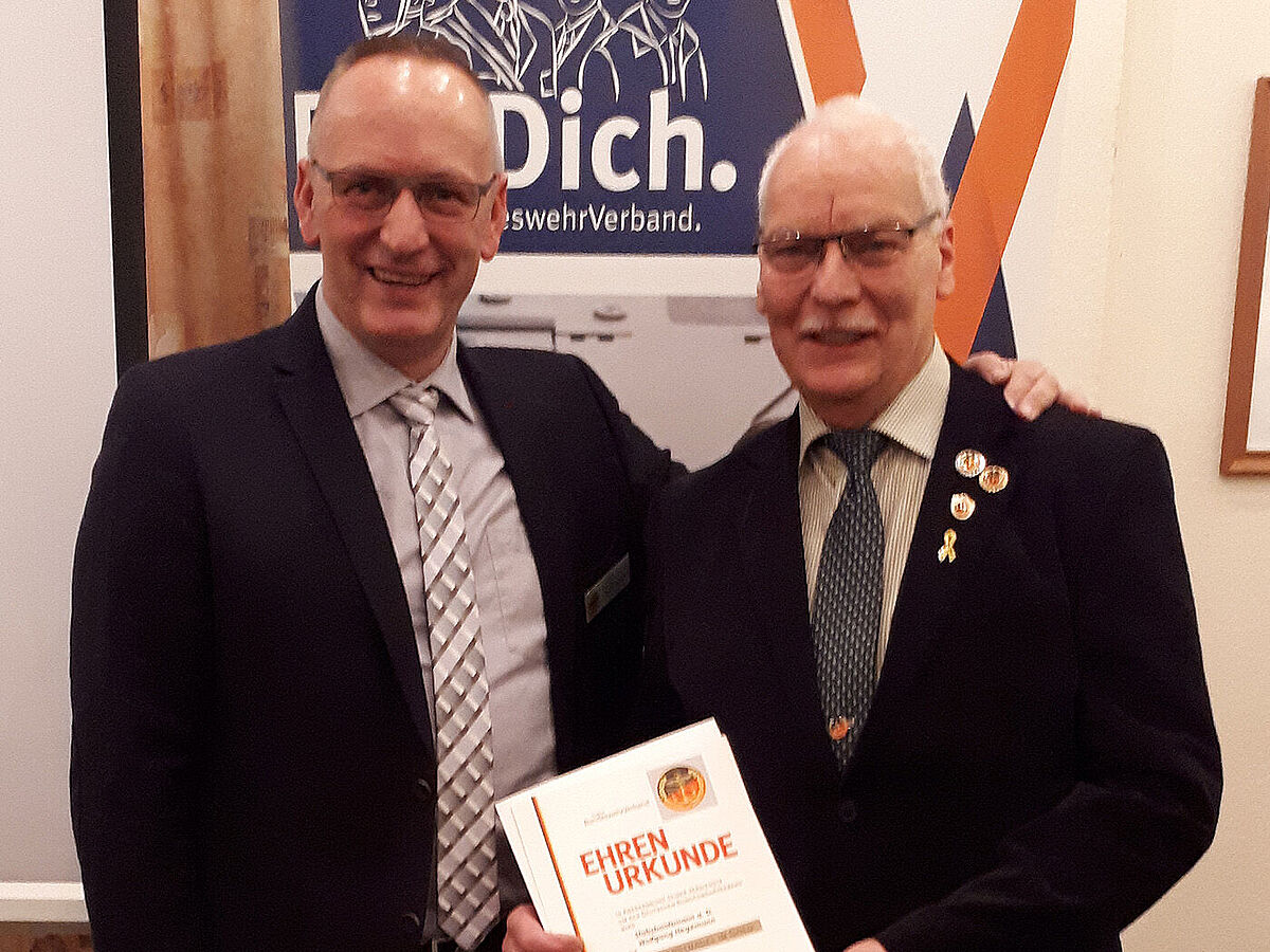 Überrascht mit einer verdienten Ehrung, die der Oberstabsfeldwebel a.D. Uwe Schenkel im Gepäck mitbrachte, wurde der langjährige Vorsitzende der ERH-Kameradschaft Nordholz, Stabsbootsmann a.D. Wolfgang Hegemann. Ihm wurde während der Mitgliederversammlung im November unter Anerkennung seiner Verdienste um den Deutschen BundeswehrVerband eine Ehrenurkunde sowie die Verdienstnadel in Gold verliehen. Die Urkunde ist unterzeichnet vom Bundesvorsitzenden, vom ERH-Vorsitzenden und vom Landesvorsitzenden Nord.