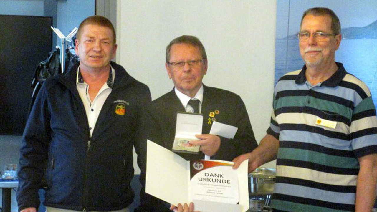 Bei der Ehrung in Kiel (v.l.n.r.): Gerd Dombrowski, Reinhard Patzlaff und Kassenwart Kapitänleutnant a.D. Klaus-Thomas Petersen. Foto: LV Nord