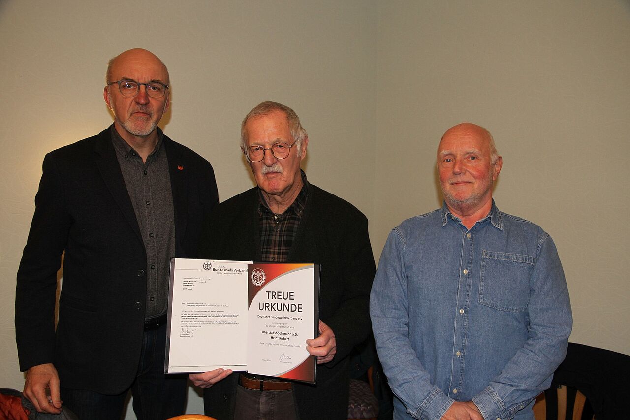 Jens Tischer (von links) mit dem geehrten Heinz Richert und dem Kameradschaftsvorsitzenden Volker Lauer. Foto: DBwV