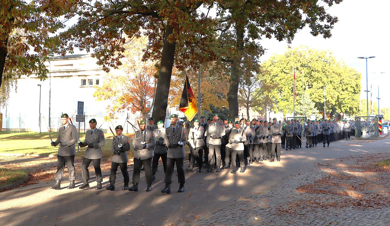 Geschlossen marschierten die rund 550 Soldatinnen und Soldaten des Jägerbataillons 413 von der Ferdinand-von-Schill-Kaserne zum Appellplatz vor der Stadthalle in Torgelow. Foto: Andreas Hase
