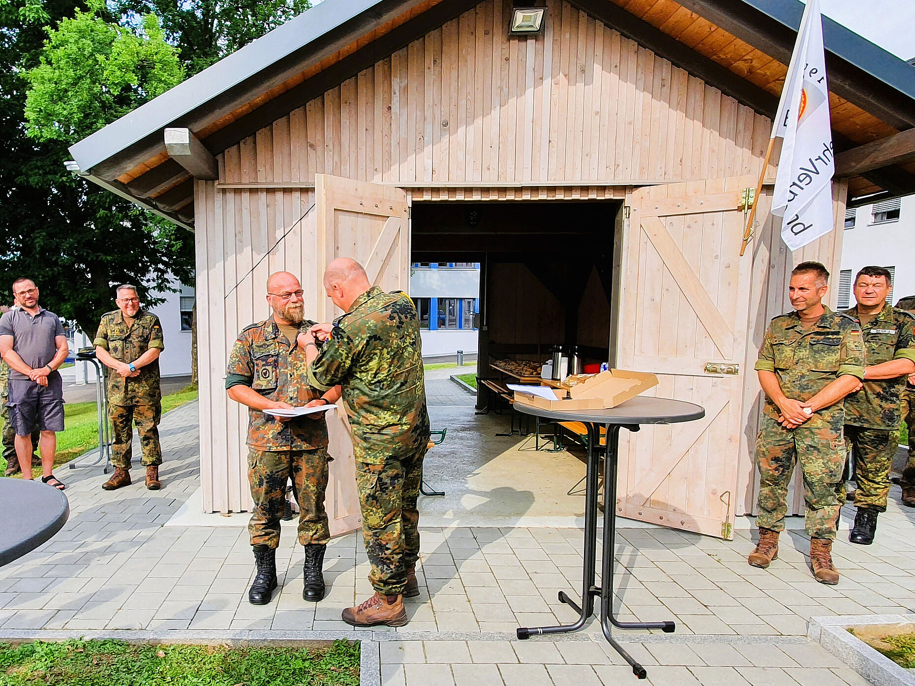 Cham. Mehr als siebzig Mitglieder folgten der Einladung der Truppenkameradschaft Nordgaukaserne zum gemeinsamen Frühstück bei schönstem Sonnenschein unter freiem Himmel. In dieser lockeren Runde informierte TruKa-Vorsitzender Oberstabsfeldwebel Marko Girndt über aktuelle verbandspolitische Themen des DBwV und Aktivitäten der Kameradschaft am Standort. Der Vorsitzende nutzte zugleich die Gelegenheit, um Oberstabsfeldwebel Andreas Scherpf für 25 Jahre Mitgliedschaft im DBwV mit der Treueurkunde und -nadel zu danken.