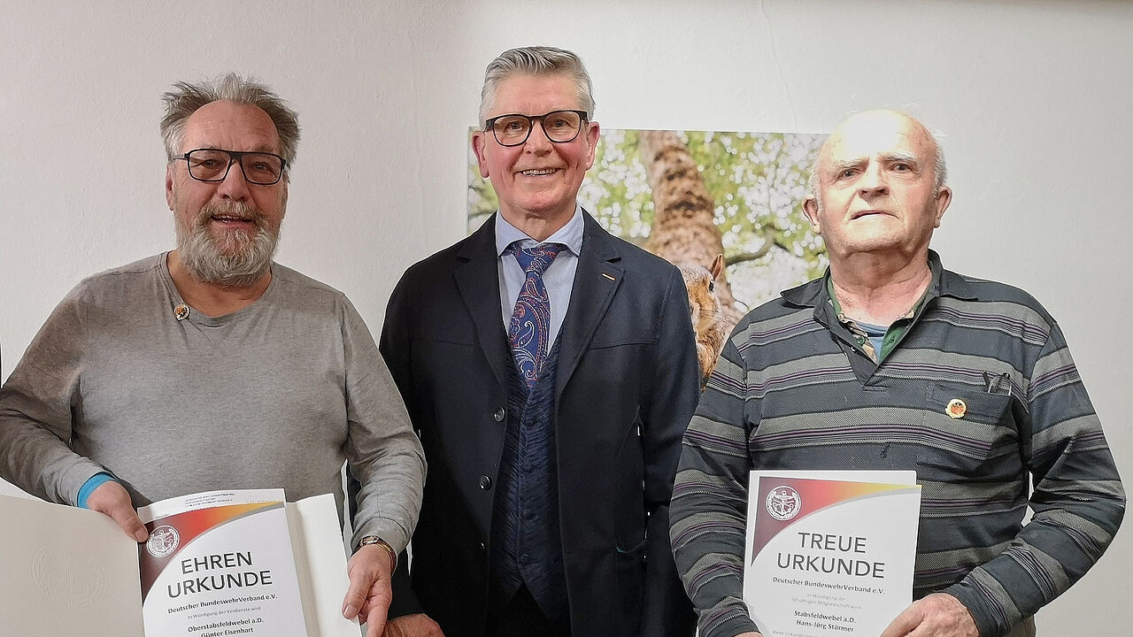 Vorsitzender Erwin Vohrer (M.) mit zwei der geehrten Mitglieder: Oberstabsfeldwebel a.D. Günter Eisenhart und Stabsfeldwebel a.D. Jörg Störmer. Foto: Winfried Riedinger