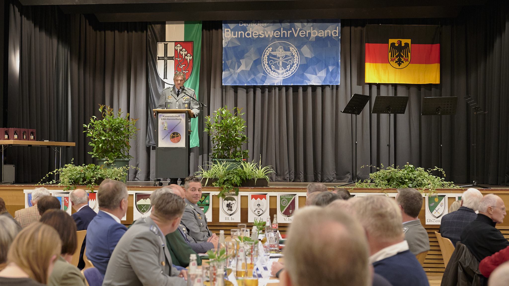 Beim abendlichen Festakt im Soldatenheim Heinrich-Köppler-Haus – musikalisch umrahmt vom Saxophon-Quartett des Heeresmusikkorps Ulm – begrüßte der Vorsitzende der Kameradschaft ERH Hammelburg, Oberstleutnant d.R. Hans-Joachim Berger, über 100 Mitglieder sowie zahlreiche Gäste aus Politik, Verband und militärischer Führung. In seiner Ansprache dankte Berger allen Anwesenden für ihre Unterstützung. Er zeichnete die Entwicklung der Kameradschaft ERH seit ihrer Gründung 1974 nach – insbesondere die letzten zehn Jahre, dokumentiert in der Jubiläumsfestschrift. Dabei verband er historische Meilensteine politischer Entwicklungen mit Veränderungen in der Bundeswehr und betonte dabei die Rolle des DBwV als verlässlicher Interessenvertreter. Berger blickte auf Erfolge der Verbandsarbeit wie bei Einsatzversorgung oder Laufbahnrecht und unterstrich, dass dies nur in einer starken Gemeinschaft möglich ist. „Deshalb ist jedes einzelne Mitglied wichtig!“