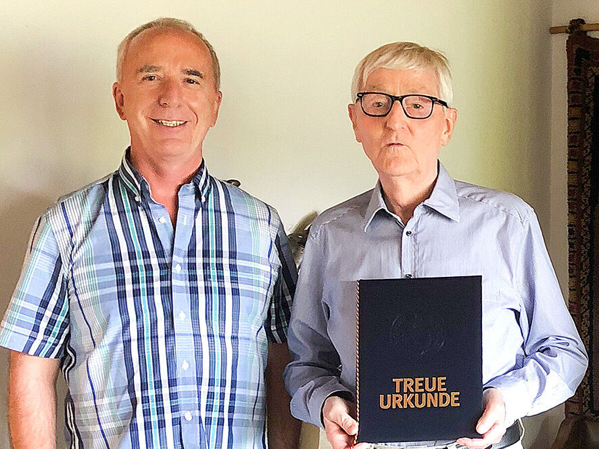 Oberst a.D. Gerd Mathes gehört dem Deutschen BundeswehrVerband seit genau 60 Jahren an. Vom Vorsitzenden der Kameradschaft ERH Rhein-Neckar Hauptmann a.D. Richard Fürstenberger und seinem Stellvertreter Oberstabsfeldwebel a.D. Werner Böhm erhielt das weitgereiste Mitglied dieser Tage dafür in seinem Haus in Neckargemünd-Dilsberg die Treueurkunde des Verbandes überreicht. Mathes hatte nach dem Abitur in Berlin 1954 zunächst ein Studium zum Veterinärmediziner begonnen und dann seine Ziele doch noch geändert. Er zog nach Westdeutschland und begann wie viele Soldaten seiner Generation seine Laufbahn in der noch jungen Bundeswehr mit der Grundausbildung in Andernach. Nach zahlreichen Verwendungen in Norddeutschland ging es zum ersten Mal ins Ausland: von 1969 bis 1970 besuchte er einen Lehrgang an der Führungsakademie der spanischen Streitkräfte in Madrid. Ab 1974 folgte dann für drei Jahre die für ihn schönste Zeit als Militärattaché in Chile. Die letzte Station bei der CENTAG in Heidelberg brachte ihn schließlich an den Neckar. Aber die Vorliebe für Südamerika blieb: Im Ruhestand zog es ihn, zusammen mit einem guten Freund, für sechs Monate an seine alte Wirkungsstätte in Südamerika, ehe ihn die familiären Bande wieder in die Heimat zurückführten.