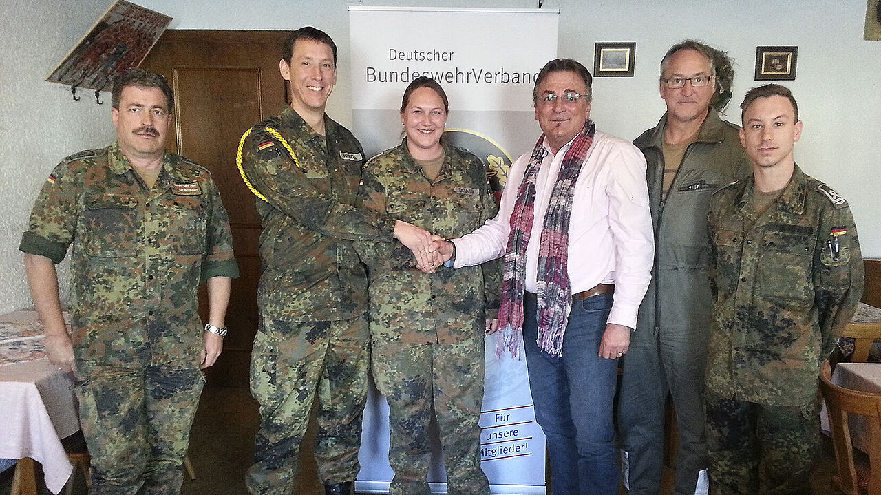 Der TruKa Vorstand mit Vorsitzendem Stabsfeldwebel Jochen Fröschle, der neu gewählten Stellvertretenden Vorsitzenden Feldwebel Stefanie Sabasch und mit Bezirksvorsitzendem Franz Jung (ab 2.v.l.) Foto: DBwV/Klaus Mößner