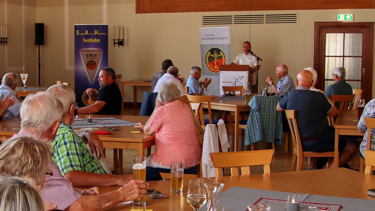 Sechzig Mitglieder und Gäste der Kameradschaft ERH Sonthofen begrüßte Vorsitzender Oberstleutnant a.D. Alfred Veit zur Sommerveranstaltung im Casino der örtlichen Betreuungsgesellschaft. Besonders gespannt waren die Teilnehmer auf den Auftritt des neugewählten Vorsitzenden im Landesverband Süddeutschland, Oberstleutnant a.D. Josef Rauch. Seine Informationen über aktuelle Aspekte der Verbandspolitik, aber auch zur Verbandsarbeit im Landesverband fanden beim Auditorium große Aufmerksamkeit.