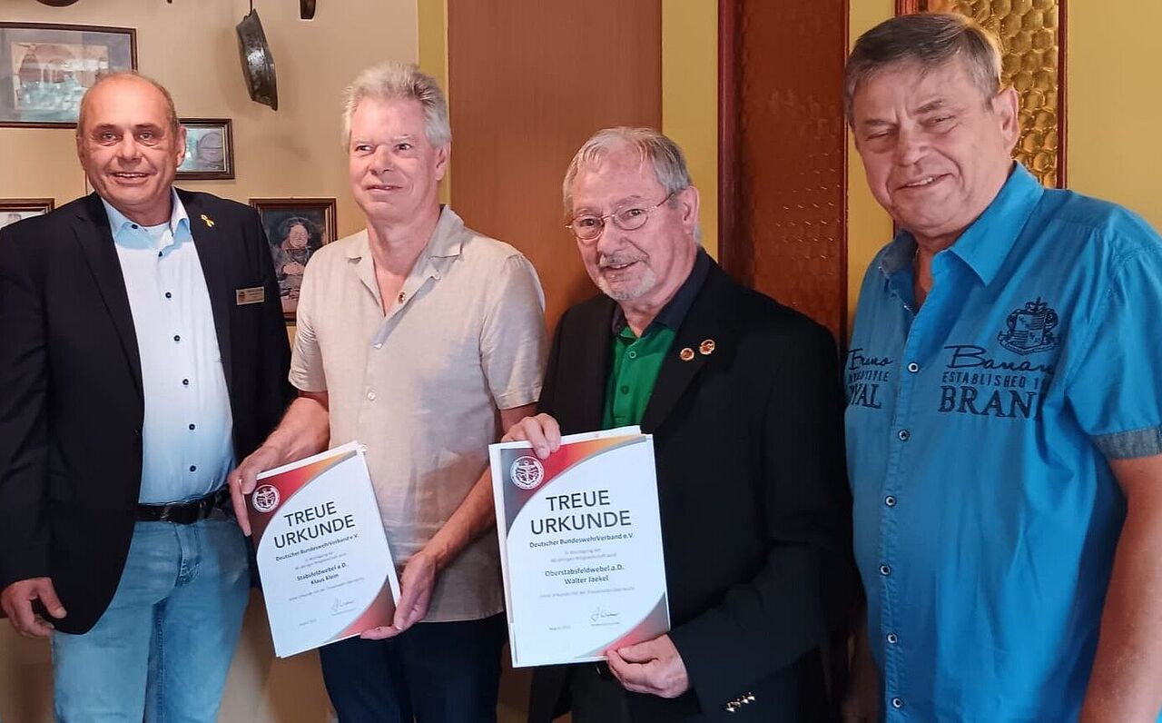 Manche geplante Veranstaltung eines Vereins würde ausfallen, wenn der Vorsitzende und sein Stellvertreter krankheitsbedingt nicht dabei sein können. Nicht so bei der Kameradschaft ERH Karlsruhe. Die Mitglieder trafen sich wie gewohnt zum monatlichen Stammtisch im August 2023, jedoch geleitet von den weiteren Vorstandsmitgliedern. Gast war Bezirksvorsitzender Stabsfeldwebel a.D. Matthias Schneider, der die Ehrung von Oberstabsfeldwebel a.D. Walter Jaekel und Stabsfeldwebel a.D. Klaus Klein für 60 bzw. 40 Jahre Mitgliedschaft im Deutschen BundeswehrVerband übernahm.