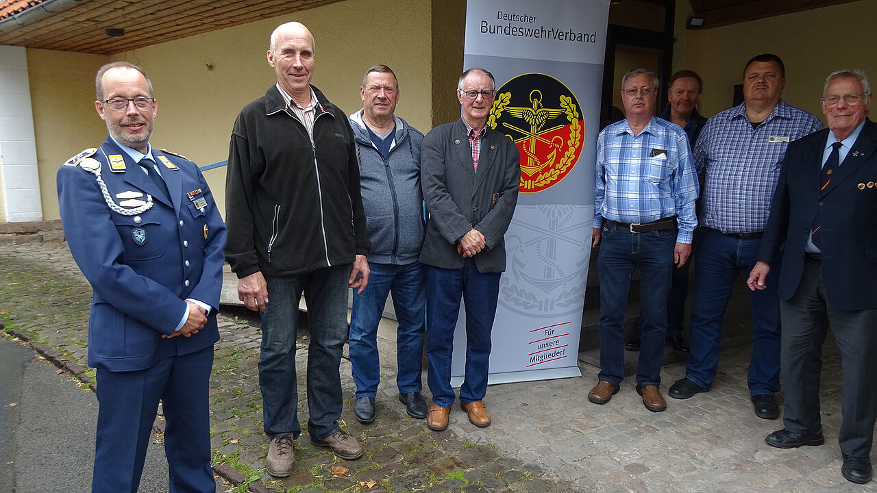 Der Stellvertretende Landesvorsitzende Stabsfeldwebel Volker Keil mit dem neuen Vorstand: Oberstabsfeldwebel a.D. Lothar Becker, Stabsfeldwebel a.D. Ralf Pickenhahn, Stabsfeldwebel a.D. Peter Kreußel, Oberstabsfeldwebel a.D. Martin Halsband, Oberstabsfeldwebel a.D. Horst Schäfer, Oberstabsfeldwebel a.D. Hartmut Schröder und Oberst a.D. Jürgen Damm (v.l.n.r.). Foto: KERH Bad Arolsen-Wolfhagen