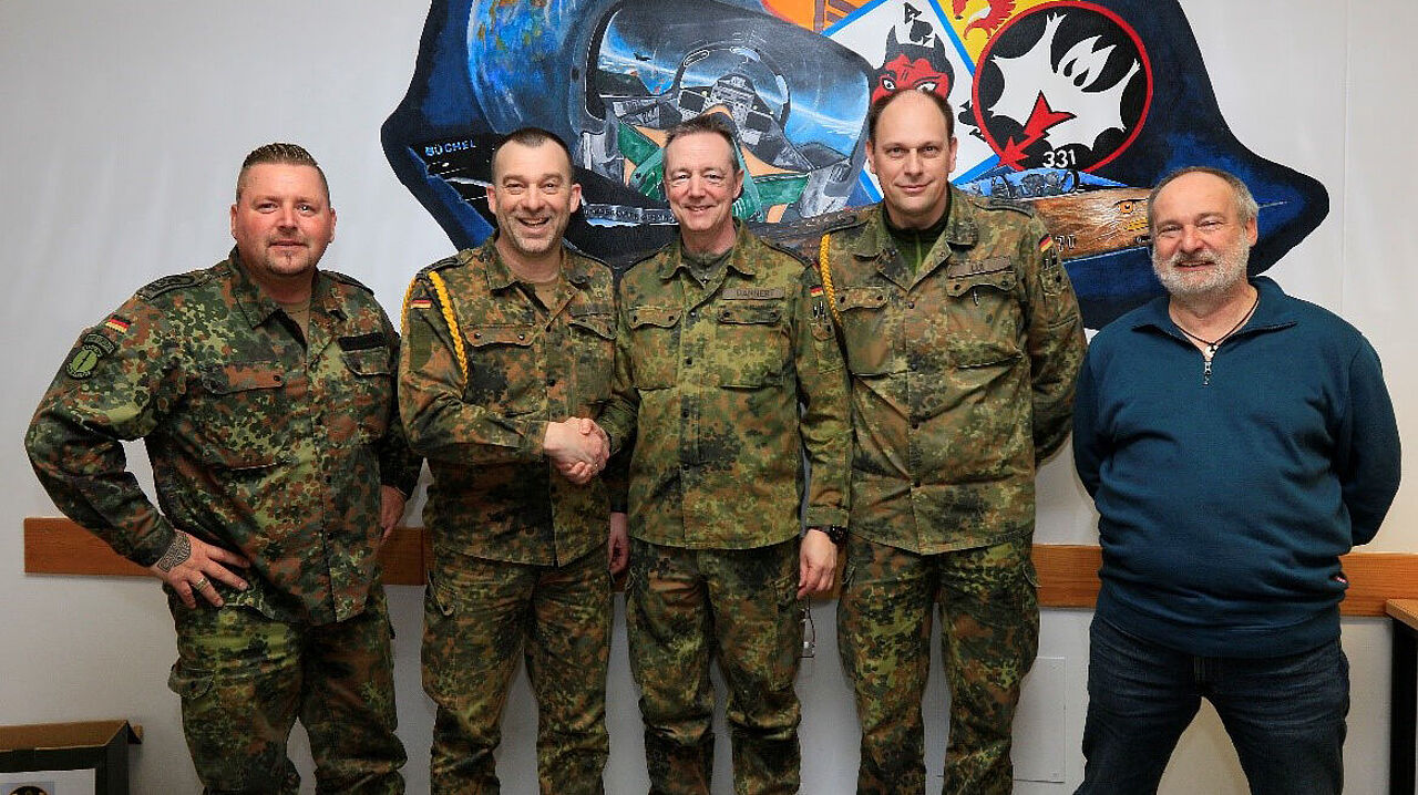 Wurde aus dem Kreis der Truppenkameradschaft verabschiedet: Ralf Dannert (3. v.l.) mit Nico Mastbraker, Nachfolger Ralf Jakobs, Michael Lui und dem Standortbeauftragten Winfried Müller (v.l). Foto: TruKa Fliegende Gruppe TaktLwG 33