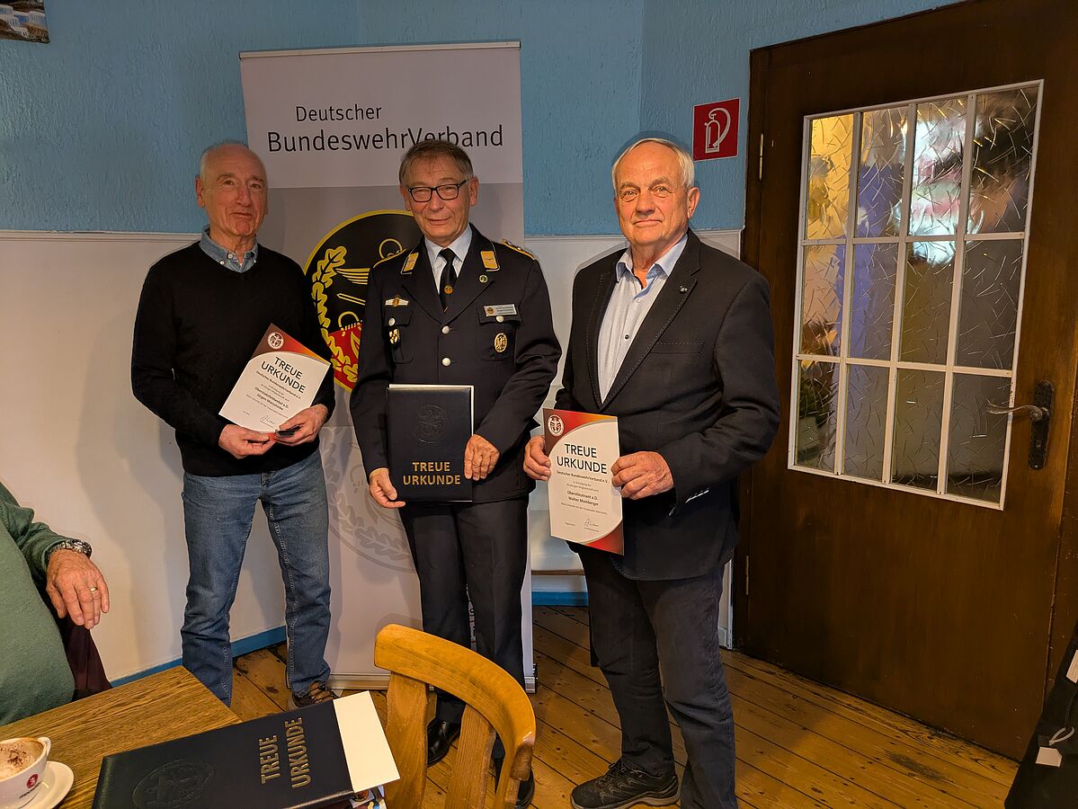 In Gießen dankte Oberstabsfeldwebel a.D. Jürgen Gemmer den Kameraden Oberstleutnant a.D. Walter Momberger (rechts) und Oberstabsfeldwebel a.D. Jürgen Marschinke (links) für ihre langjährige Mitgliedschaft im DBwV. Foto: Ralf Schuchard