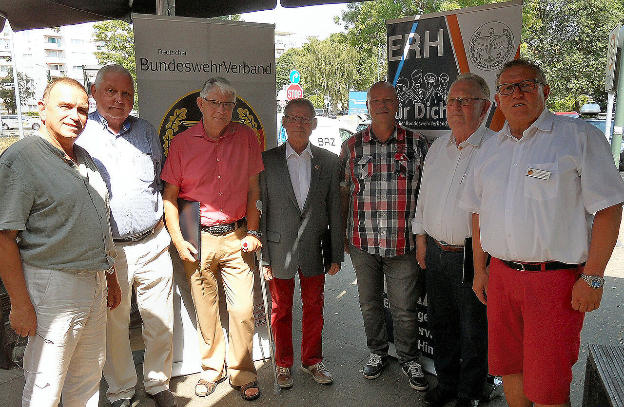 Ausgerechnet am heißesten Tag des Jahres fand das Grillfest der KERH Düsseldorf-Bergisches Land statt. Doch auch die Hitze konnte die Mitglieder nicht von einer Teilnahme abhalten, berichtet Oberstleutnant a.D. Andreas Schnellbach. Vorsitzender Uwe Börner hatte nicht nur warme Worte zur Begrüßung, sondern auch etwas Handfestes für zwei Jubilare dabei: Oberstabsfeldwebel a.D. Helmut Sommer überreichte er die Treuenadel mit Urkunde für 60 Jahre Mitgliedschaft im DBwV. Oberstabsfeldwebel a.D. Egon Kuhne und Stabsfeldwebel a.D. Erwin Schwark erhielten Nadel und Urkunde für ihre 50 jährige Treue. Ehrengäste waren der Bezirksvorsitzende, Hauptmann a.D. Michael Grothe und -erstmals in neuer Funktion als Landesvorsitzender Ehemalige- Oberstabsfeldwebel a.D. Rudolf Schmelzer.