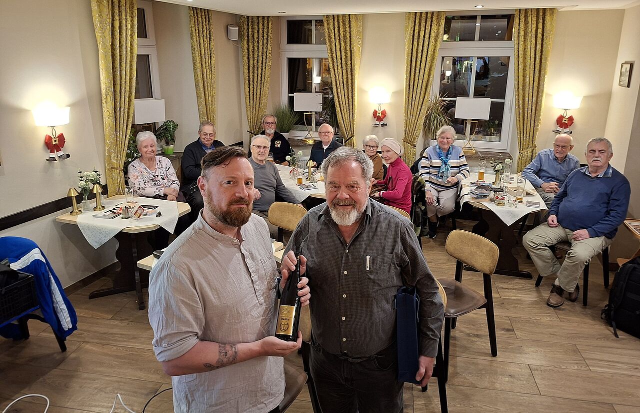 Nach dem interessanten Vortrag dankte der Vorsitzende der KERH, Fregattenkapitän a.D. Ulf Neelsen, dem Vortragenden und übereichte zum Dank einen guten Tropfen von der Ahr. Foto: Jürgen Schumacher