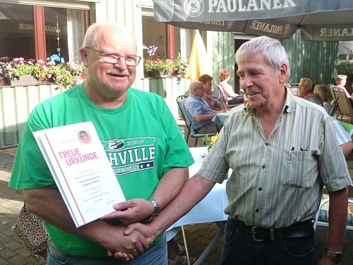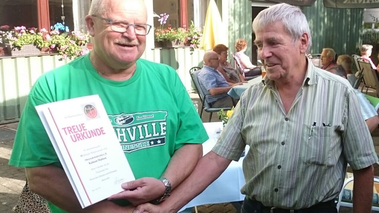 Ehrung nach der Brandschutzausbildung: Vorsitzender Kurt Krummenauer übergibt Kalmann Mattern (li) die Urkunde für 40 Jahre Mitgliedschaft im Verband Foto: KERH Kusel
