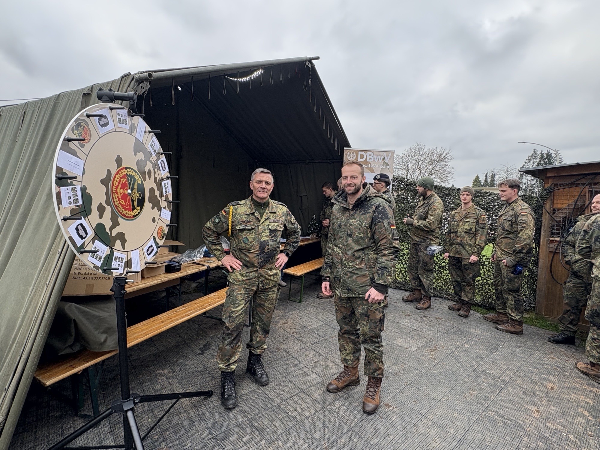 „Die Truppenkameradschaft hat die Adventszeit, wie gewohnt, besonnen und zünftig eingeläutet und auch wieder eine etwas andere mitgliedererhaltene Maßnahme in der Graf-Haeseler Kaserne in Lebach durchgeführt“, so der Vorsitzende der Truppenkameradschaft, Oberstabsfeldwebel Frank Schmitt. Schmitt und sein Vorstandsteam hatten die Angehörigen der Truppenkameradschaft zu einem Treffen bei vorweihnachtlicher Stimmung eingeladen und 117 Kameradinnen und Kameraden kamen der Einladung gerne nach. Beim Eintreffen der DBwV-Mitglieder nutzte der TruKa Vorstand die Gelegenheit zum Datenabgleich, bevor es zum kameradschaftlichen Austausch ging.