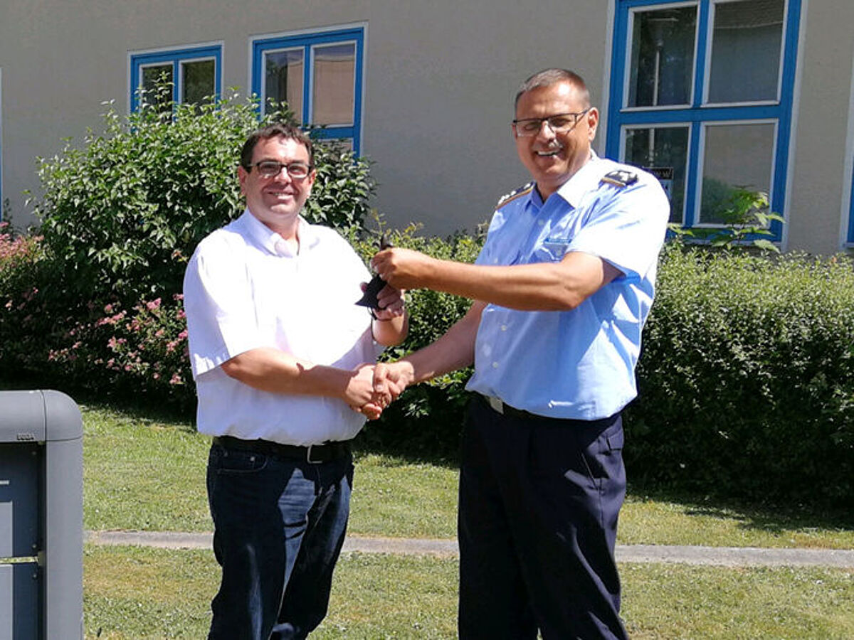 Im Vorfeld der konstituierenden Sitzung im Mai 2016 hatten die Verantwortlichen des Deutschen BundeswehrVerbands (DBwV) und der Vereinten Dienstleistungsgewerkschaft (ver.di) vereinbart, den Vorsitz im Hauptpersonalrat in der Mitte der Wahlperiode zu wechseln. Ziel war und ist es, eine gewinnbringende Zusammenarbeit der beiden größten Interessenvertretungen während der Amtszeit für alle Bundeswehrbeschäftigten sicherzustellen. Die vergangenen zwei Jahre haben gezeigt, dass beide Seiten verlässliche Partner sind.Stabshauptmann Martin Vogelsang (DBwV), der seit Mai 2016 das Gremium als Vorsitzender leitete und nach außen vertreten hat, übergab nun die „Sitzungsglocke" als symbolischer Staffelstab an seinen Nachfolger Torsten Schmidt (ver.di), Gruppensprecher der Arbeitnehmer, in der Geschäftsstelle des HPR in Haus 12 in Bonn. Der DBwV und ver.di stellen statusübergreifend die meisten Mitglieder im HPR. Der „alte“ und der „neue“ Vorsitzende sind sich einig, sich auch weiterhin als Team für die Kolleginnen und Kollegen als auch für die Kameradinnen und Kameraden einzusetzen. Oberstabsfeldwebel a.D. Andreas Hubert, Vorsitzender des Fachbereiches Beteiligungsrechte, dankt Vogelsang - der sich im HPR künftig als 1. Stv. Vorsitzender weiterhin für die Belange der Menschen in der Bundeswehr einsetzen wird - und der DBwV-Fraktion für die bisher geleistete erfolgreiche Arbeit.
