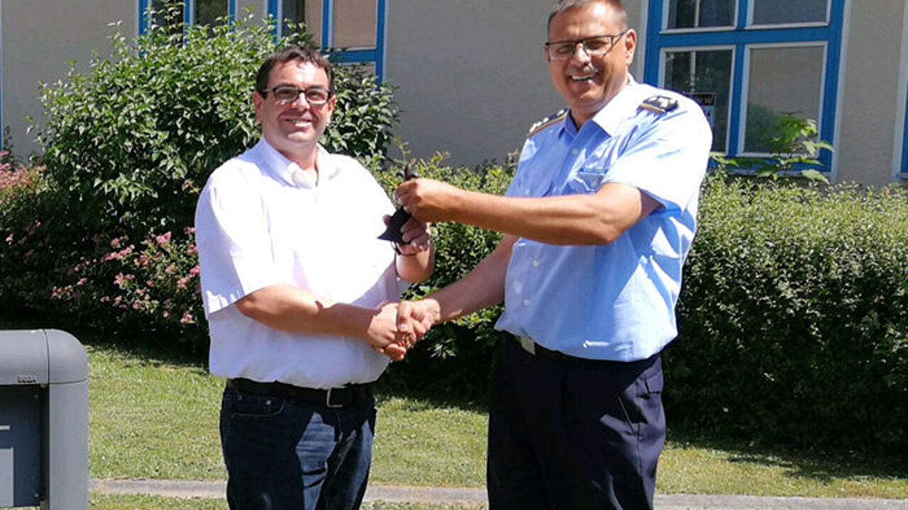 Stabshauptmann Martin Vogelsang übergibt die Sitzungsglocke an Torsten Schmidt Foto: HPR/Hahn