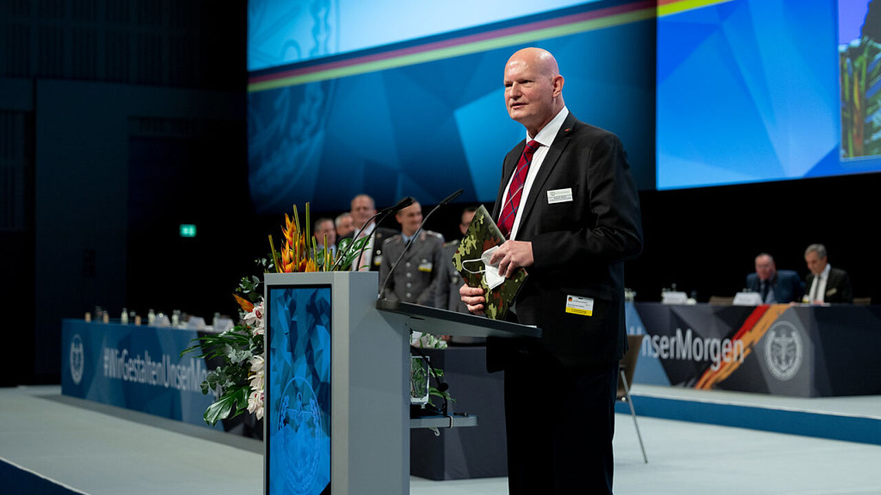 Klaus-Hermann Scharf, Vorsitzender des Fachbereichs Zivile Beschäftigte im DBwV, während der 21. Hauptversammlung des Verbandes im Dezember 2021. Foto: DBwV