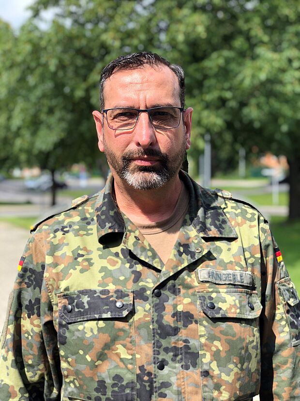 Kennt er alles so in etwa, sagt Michael Hüngerle, 53, Kampfhubschrauberregiment 36, Oberstabsfeldwebel, 33. Dienstjahre mittlerweile, sieben Auslandseinsätze, die meisten davon in Afghanistan. 2009 nach Schließung der Kaserne in Bad Segeberg, wechselt er in das militärische Nachrichtenwesen. Der Stress wird nicht weniger: Schusswechsel, Raketenangriffe, Exhumierung von Massengräbern, Bosnien, Kosovo, „einiger Mist“, sagt er. Er sagt, er hat einiges hinter sich: „Bisschen was.“ Und ein bisschen zu viel, denn aus den Einsätzen bringt Oberstabsfeldwebel Hüngerle (Foto unten: DBwV/Philipp Kohlhöfer) , Grenadier, Bilder mit, die sich wie ein zäher Kaugummi in ihm festkleben und immer wieder auftauchen, ihn zurückwerfen nach damals.